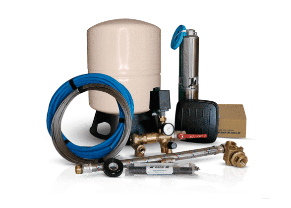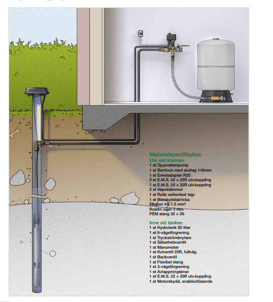Kompletta pumpanläggningar för borrade brunnar. Endast kabel och slang mellan byggnad och brunn tillkommer.
