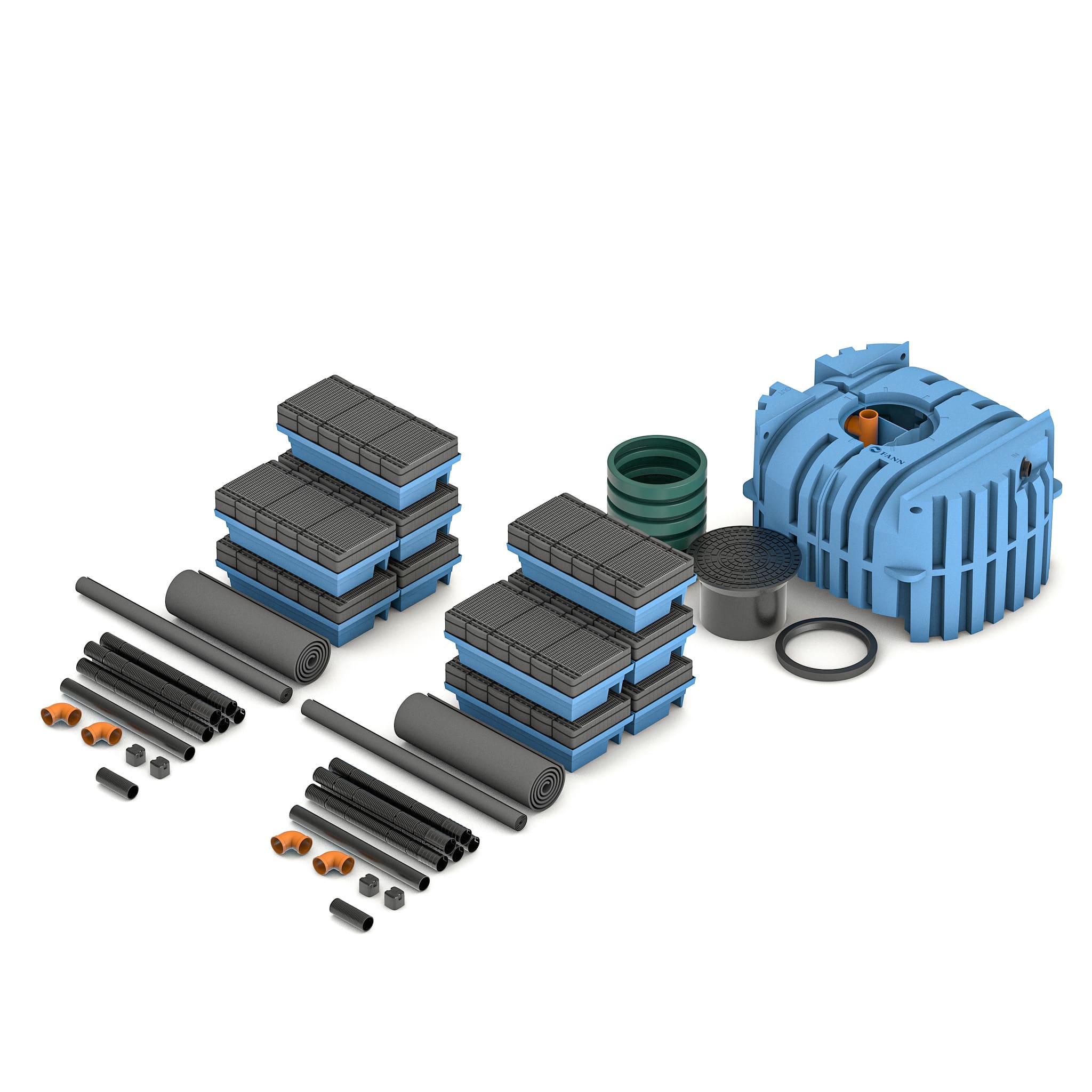 Infiltrationsanläggning med FANN Blue Trekammarbrunn tillsammans med INDRÄN Plus moduler som används för att effektivisera den biologiska reningsprocessen. INDRÄN Plus mer än tiodubblar ytan för den biologiska reningsprocessen. INDRÄN Plus är också ett komplett biofilter som ersätter grus-/stenlagret i en infiltration då den blå lådan redan innehåller ett prefabricerat grusmaterial. Bilden avser ett (2) hushåll.