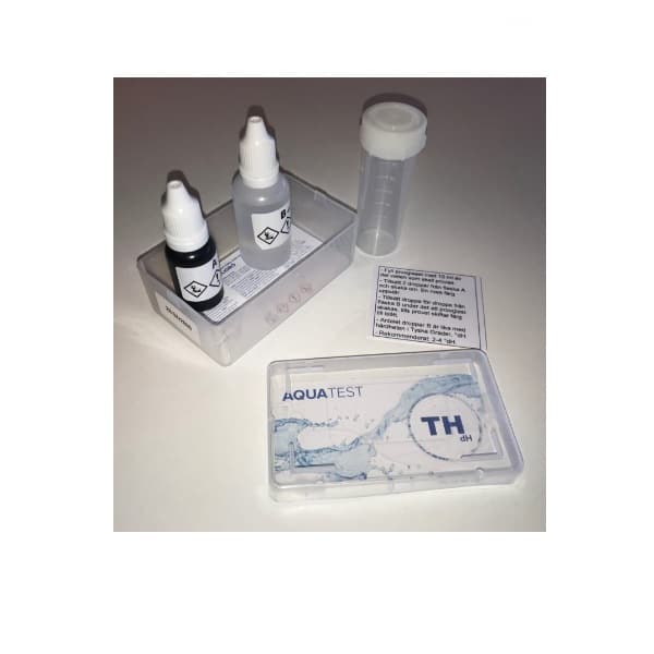 Innehåller provrör och 2 olika vätskor, droppa i först den ena och vattnet blir rosa sen motsvarar varje dropp av den andra vätska, varje droppe motsvarar en tysk hårdhetsgrad och när vattnet skiftar färg från rosa till blå vet man hur hårt vattnet är
