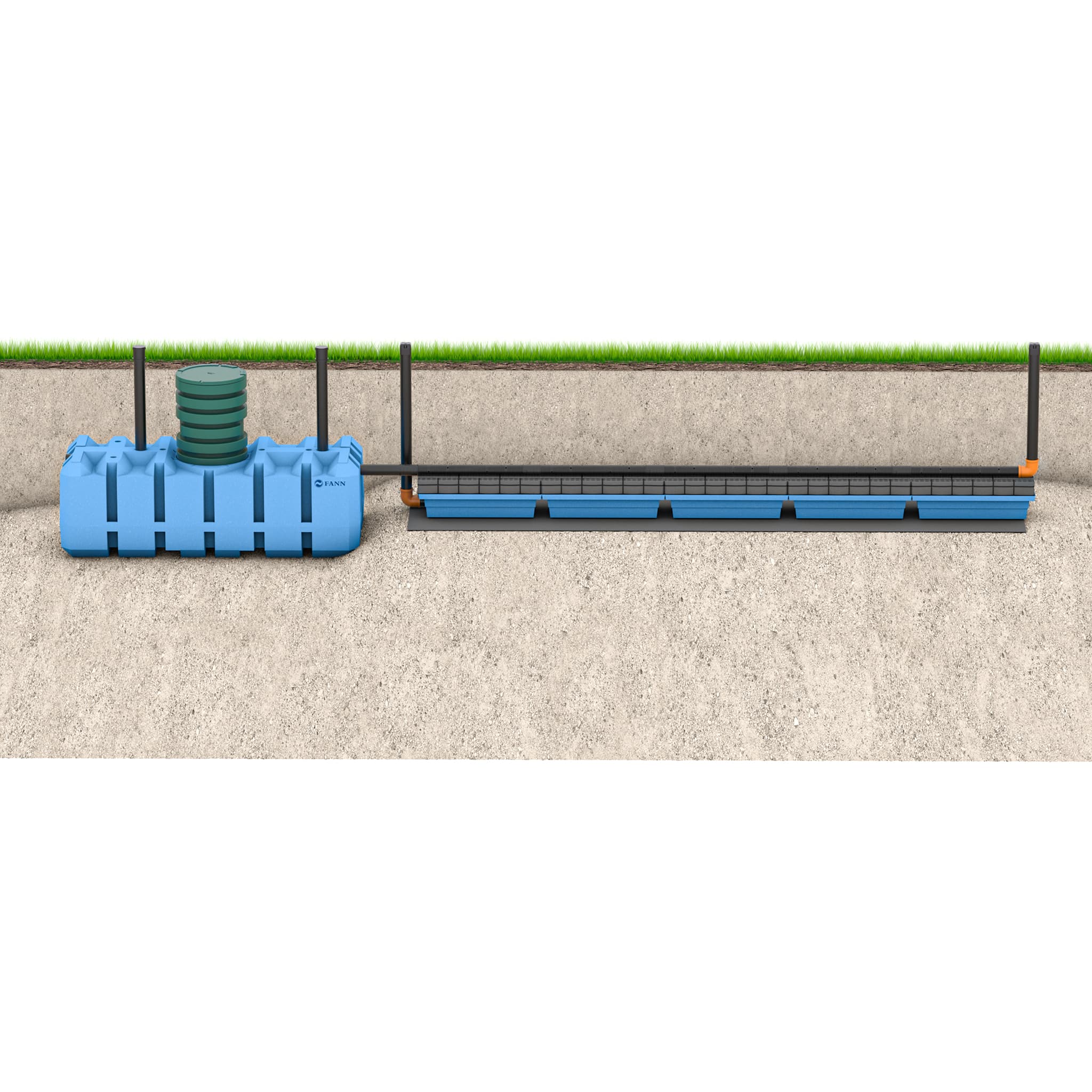 Infiltrationsanläggning med lågbyggande slamavskiljare tillsammans med INDRÄN Plus moduler som används för att effektivisera den biologiska reningsprocessen. INDRÄN Plus mer än tiodubblar ytan för den biologiska reningsprocessen. INDRÄN Plus är också ett komplett biofilter som ersätter grus-/stenlagret i en infiltration då den blå lådan redan innehåller ett prefabricerat grusmaterial.