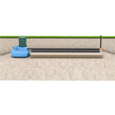 Infiltrationsanläggning med lågbyggande slamavskiljare tillsammans med INDRÄN PRO moduler som används för att effektivisera den biologiska reningsprocessen. INDRÄN mer än tiodubblar ytan för den biologiska reningsprocessen.