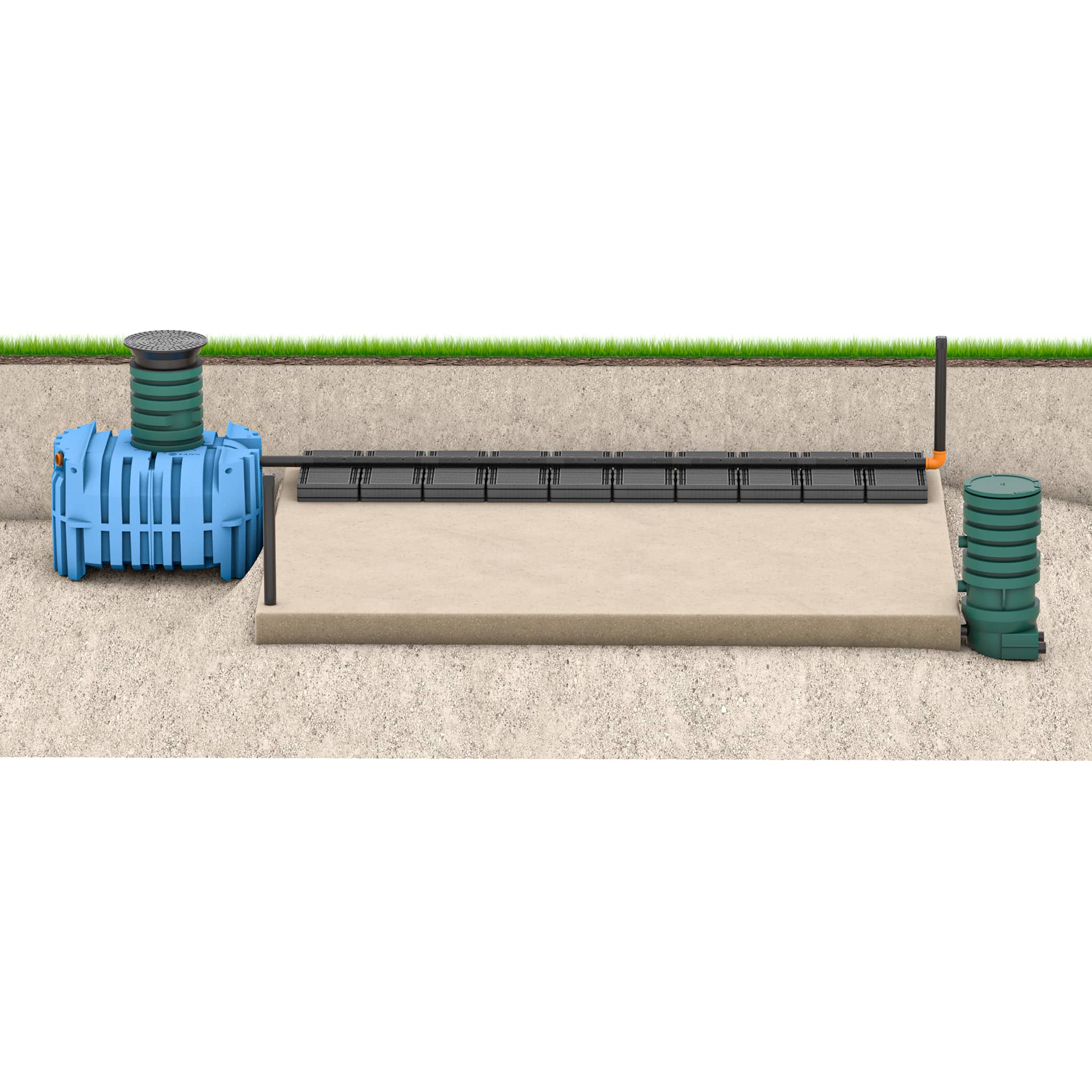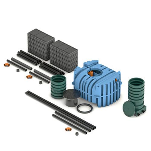 Markbäddsanläggning med FANN Blue Trekammarbrunn tillsammans med INDRÄN PRO moduler som används för att effektivisera den biologiska reningsprocessen. INDRÄN mer än tiodubblar ytan för den biologiska reningsprocessen.
