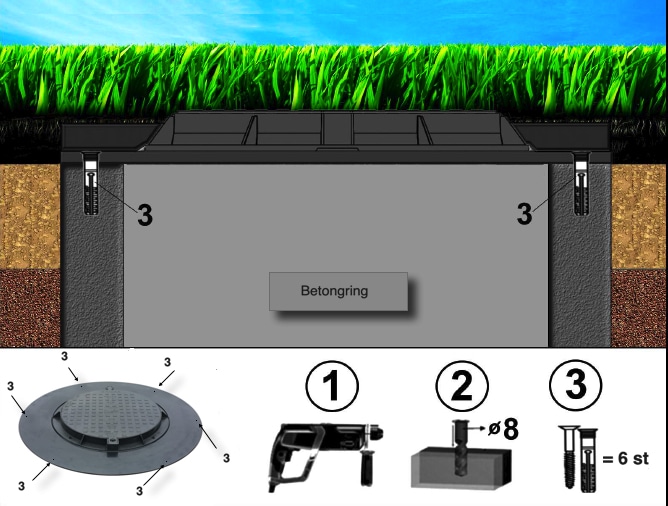 Enkel montering, monteras ovanpå brunnsringen med 5st medföljande betongskruvar.